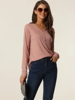 Cheibear Womens Casual V Neck Ribbed Pullover Long Sleeve Sleepwear Tops