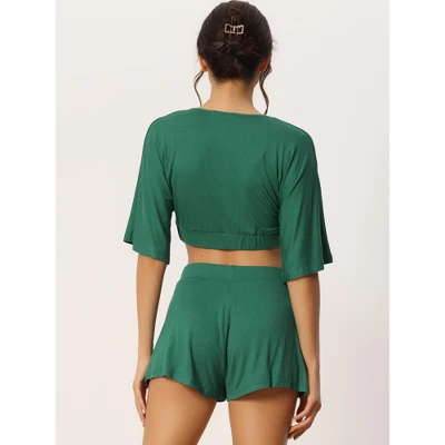 This set with wrap v-neck, flare short sleeve, and crop design, is stylish and sweet for daily wear, casual weekends, or yoga time.These lounge sets are modal fabric, slightly stretched, and easy on the skin, which will keep you from daily stresses and provide you with a soft and comfortable.With a classic v-neckline, and good clothes cutting, this solid color set is everything you need for the cozy day-to-night wear, lounging, and sleeping.The pull-on closure, and elastic waist design make it easy to take on and off, and stay comfortable all day.This 2 piece lounge set is suitable for casual, daily, shopping, beach, vacation, home wear, or simply as a lovely “Just because” gift.Casual style – faux wrap v-neck design on the tops for a casual fit, which drapes beautifully and shows an elegant and stylish look. Elastic waistband shorts provide a snug and gentle fit, and great length for lounging around the house or sleeping on the bed.