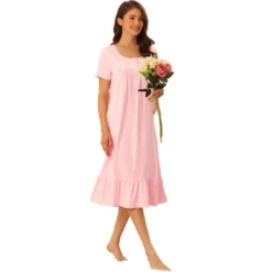 Mid-calf length long nightshirt with lace trim decor at the front, ruffle hem and pleated front, and half placket, make this nightgown stylish and comfortable for nightwear.Nightgown with square neck, lace decor front, short sleeves, ruffled hem, and cuffs, stylish and sweet for comfortable nightwear, suitable for everyday wear in spring, summer, or fall.With a retro square neckline, and good clothes cutting, this a-line long gown is everything you need for cozy day-to-night wear, lounging, and sleeping.The half placket with buttons and a-line design makes it easy to take on and off, stay comfortable all night, and have a sweet dream.With a full-length design, this nightgown is suitable for a slumber party, sleeping, pajama party, girls’ day, Christmas, or simply as a lovely “Just because” gift.