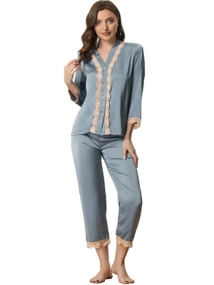 - Featuring 2 pieces, soft lace trimbutton shirt and long pants