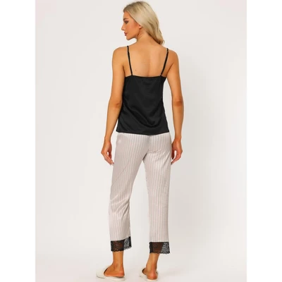 Cheibear Womens Satin Lounge Stripe Lace Trim Cami Tops With Pants Sleepwear Pajamas Sets